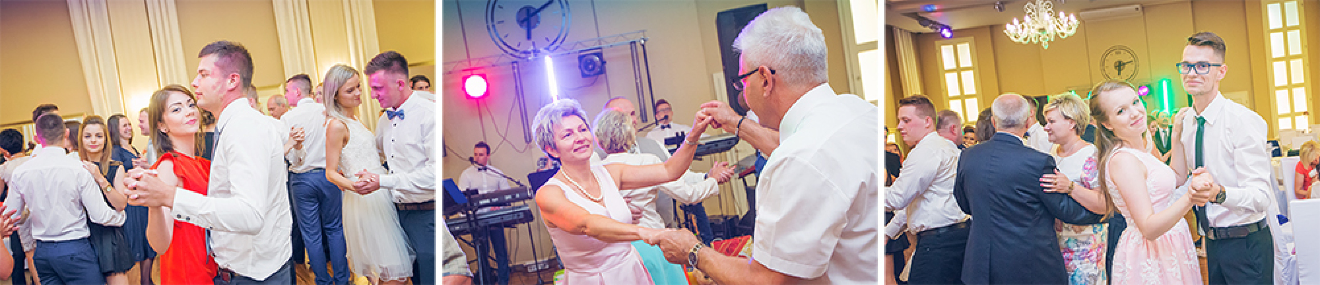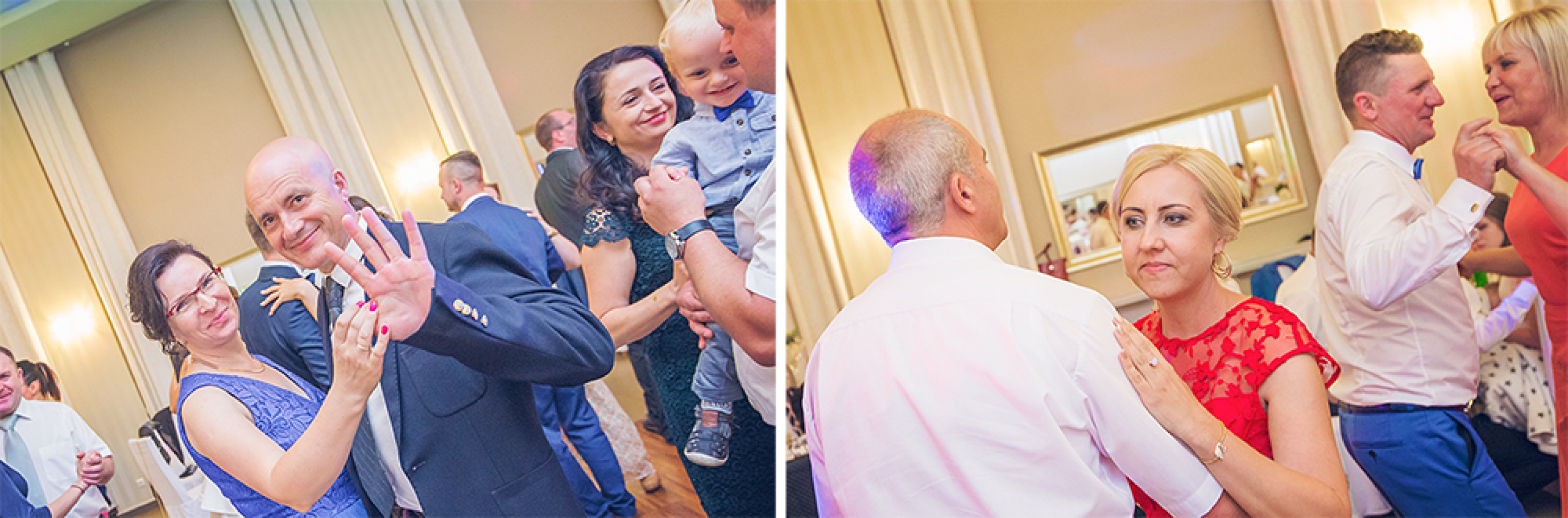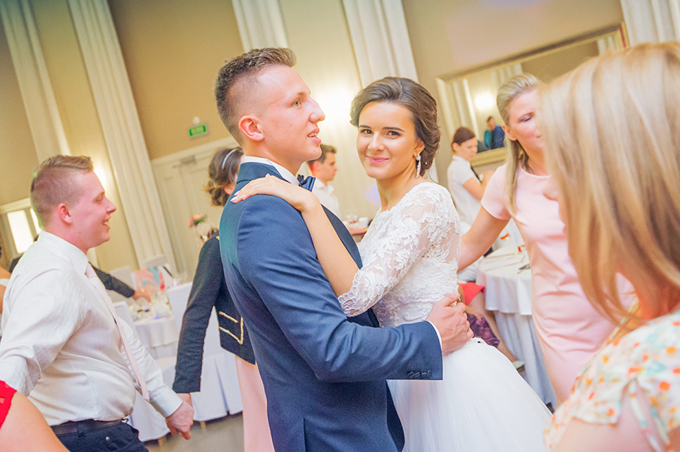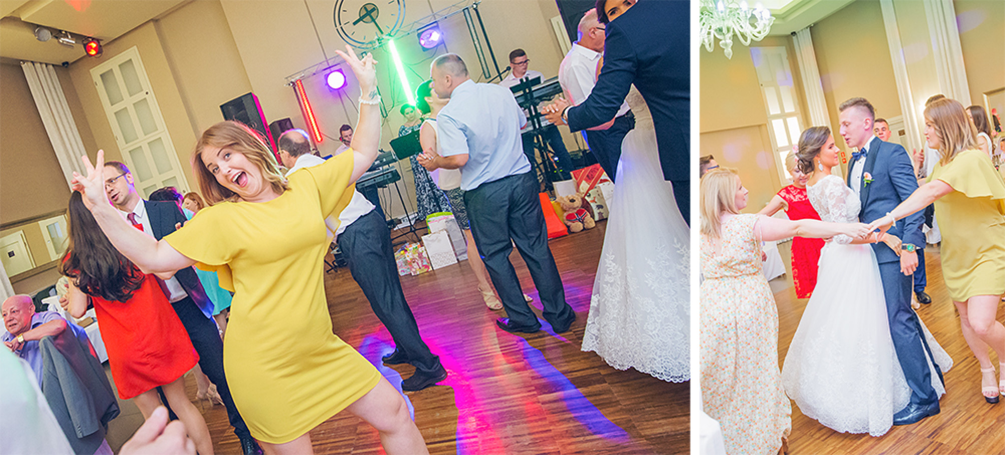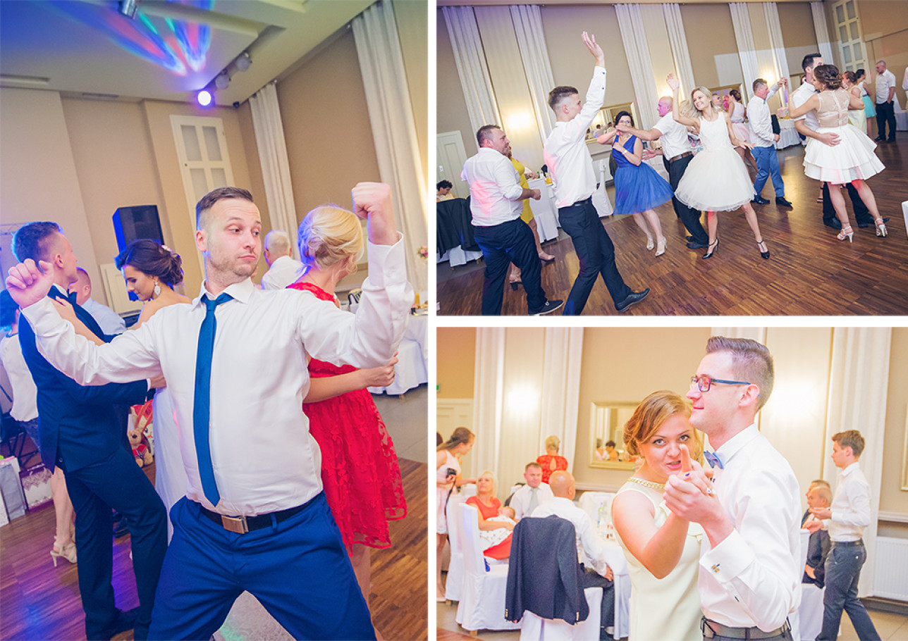 Powitanie na sali, życzenia, pierwszy taniec.  Uff… Młodzi mogą odetchnąć  :) Została już tylko zabawa.  Od tego momentu szukamy szalonych pląsów i niepowtarzalnych układów na parkiecie weselnym. Staramy się na  obrazku oddać atmosferę imprezy  i dynamikę zabawy.