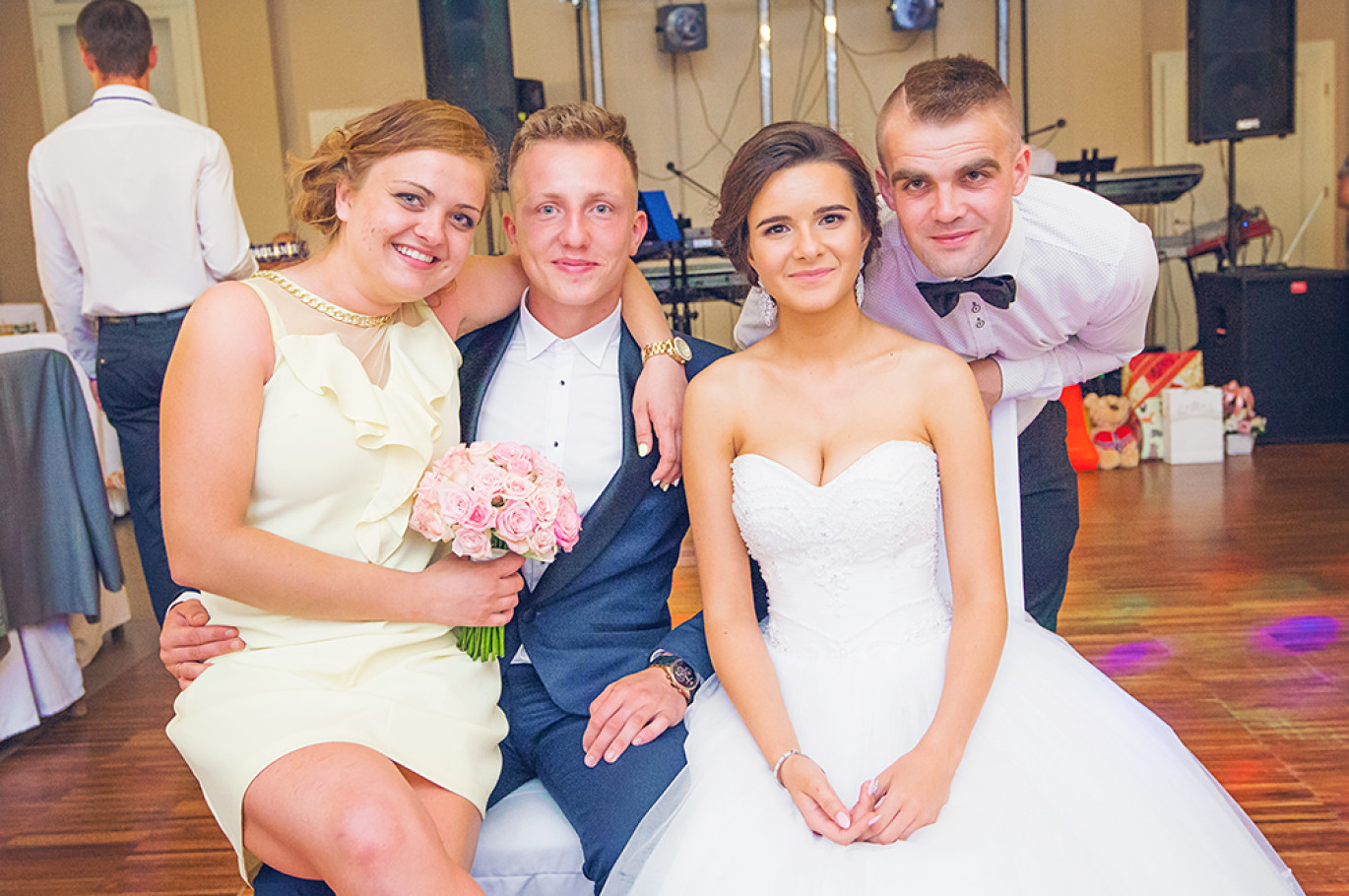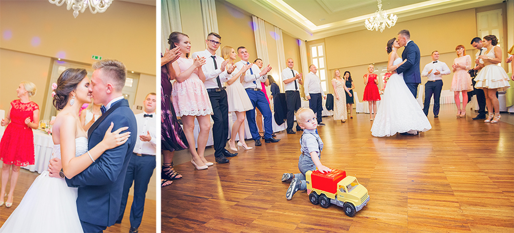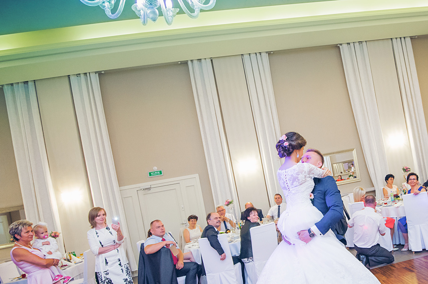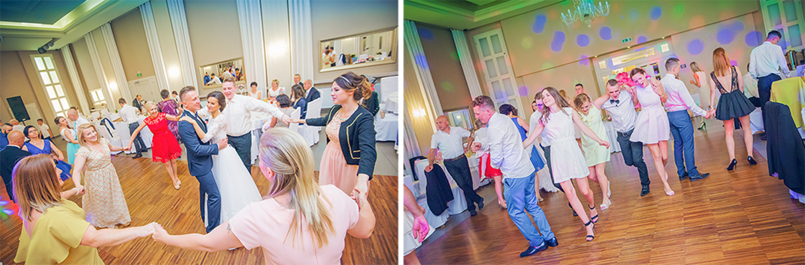 Powitanie na sali, życzenia, pierwszy taniec.  Uff… Młodzi mogą odetchnąć  :) Została już tylko zabawa.  Od tego momentu szukamy szalonych pląsów i niepowtarzalnych układów na parkiecie weselnym. Staramy się na  obrazku oddać atmosferę imprezy  i dynamikę zabawy.